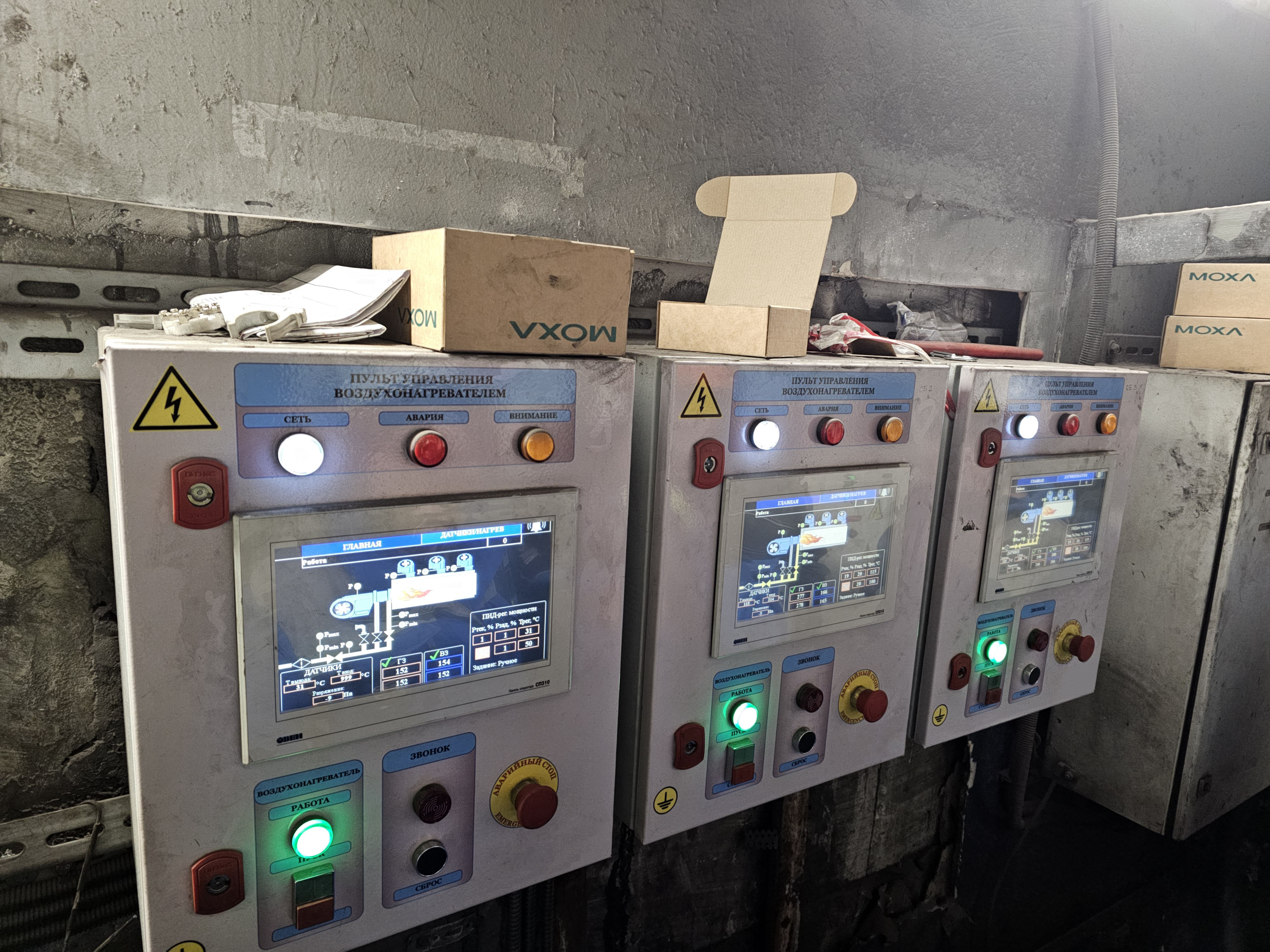 Система автоматики и управления установками выполнена на базе ПЛК с визуализацией на сенсорных панелях. Одна панель установлена непосредственно на шкафу управления, который расположили рядом с теплогенератором, вторая панель вынесена на пульт управления в помещение операторов. Настроен обмен данными с действующей системой управления сушильным комплексом на базе контроллера Siemens Simatic S7-1200. Отлажен обмен данных с общей заводской системой SCADA.