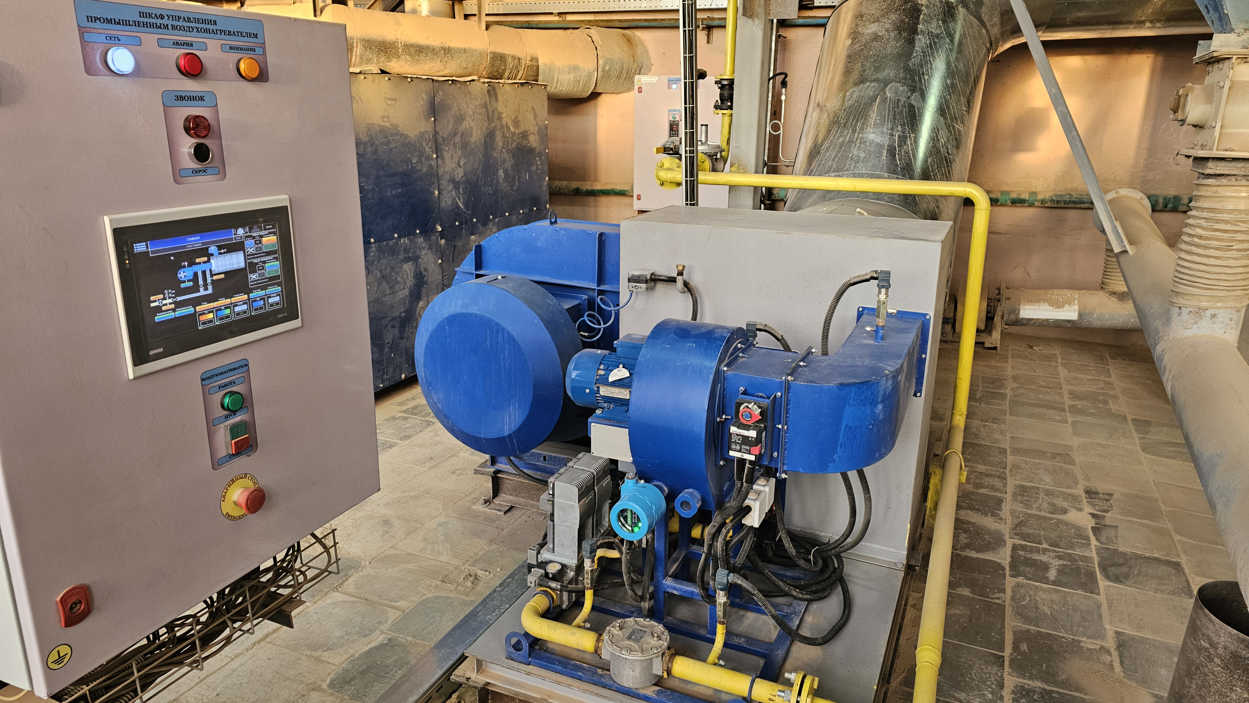 Воздухонагреватель и его горелка управляются шкафом управления, собранным на базе сенсорного панельного контроллера. Отлажен автоматический режим работы с контролем всех необходимых параметров.